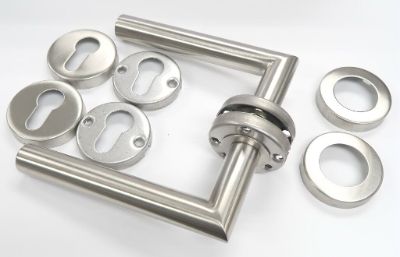 Deurkruk met rozetten, RVS (recht model), stift 120 mm