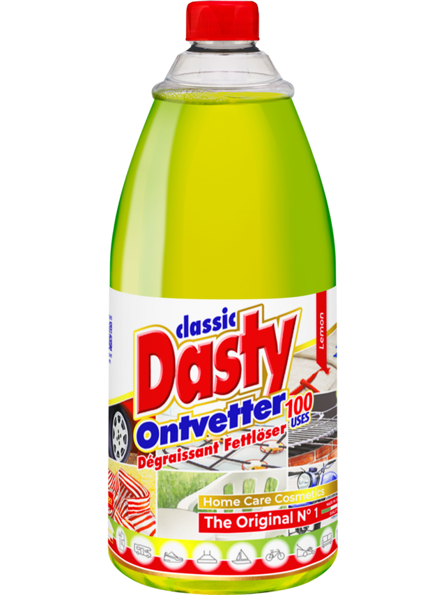 Dasty Ontvetter Classic (1 liter) is onze universele ontvetter en de ideale oplossing binnen en buiten het huis, in de garage en in de tuin: ideaal voor ovens, kookplaten, afzuigkappen, grills, snijmachines, vloeren, afwas (voorbehandeling), trainingsschoenen, motorfietsen, fietsen, manchetten en kragen (voorbehandeling) en vele andere lastige vlekken.