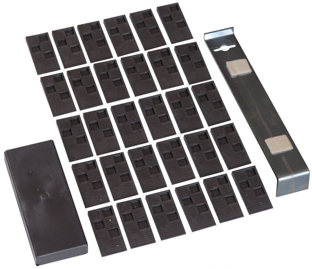 aanslagblok van kunststof, afstandshouders en aanslaghaak voor moeilijk bereikbare plaatsen.