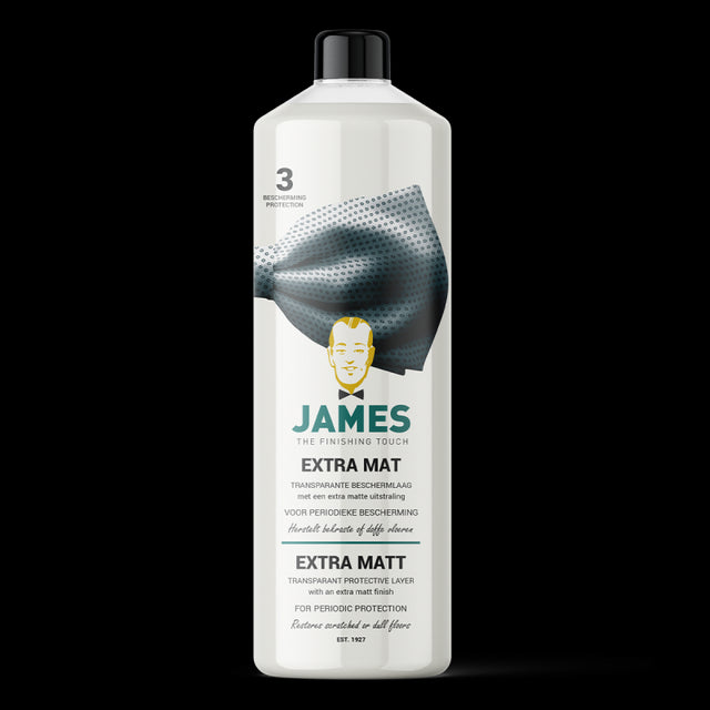 Deze unieke formule is ideaal voor moderne, ultramatte vloeren of om elke vloer een extra matte touch te geven. Perfect voor nieuwe of beschadigde vloeren, het biedt een transparante, extra matte, antislip en krasvaste laag. Geschikt voor een breed scala aan vloertypen, waaronder vinyl, PVC, linoleum, rubber, en natuur- en kunststeen. James Extra Mat houdt je vloer langer mooi en is eenvoudig te herstellen bij krasjes. Het wordt niet aanbevolen voor egaal donkere vloeren vanwege mogelijke streepvorming. Een flacon dekt circa 20 m² en is ook verkrijgbaar in een 10 L can. Voor de beste resultaten, reinig je vloer met James Basisreiniger en voor dagelijks onderhoud, gebruik James Vloerreiniger Schoon & Snel Droog.