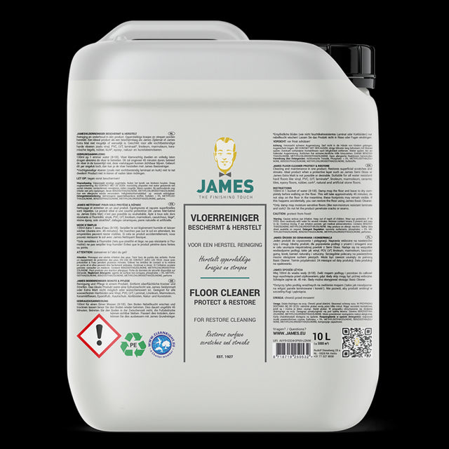 Ideaal als de vloer lichte krasjes en strepen vertoont en een beschermlaag zoals James Zijdemat of James Extra Mat niet geschikt is. Voor dagelijkse reiniging is James Vloerreiniger Schoon & Snel Droog de beste keuze. Gebruik James Vloerreiniger Beschermt & Herstelt totdat de oppervlakkige krasjes volledig verdwenen zijn en schakel dan over naar James Vloerreiniger Schoon & Snel Droog. Houd er rekening mee dat na gebruik van deze reiniger, de vloer een langere droogtijd heeft van ongeveer 45 minuten. Betreed de vloer niet tijdens deze periode.